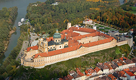 梅爾克修道(dào)院 是一座本笃會(huì)修道(dào)院,以其華麗的巴洛克式建築和圖書館豐富的館藏而聞名于世。修道(dào)院建在河畔的山岩上,俯瞰多瑙河,地勢險要。修道(dào)院的圖書館收藏了大量的手稿真迹,聞名中世紀歐洲。